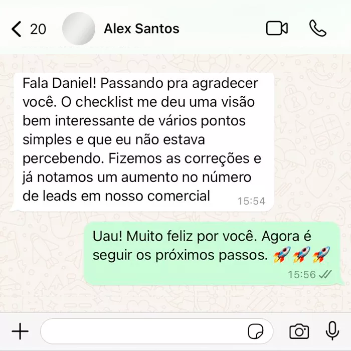 Feedback prático e direcionado. Eu e minha equipe faremos uma análise das suas ações com base no Plano de Ação Personalizado, apontando o que deu certo, o que precisa ser melhorado e como ajustar para obter resultados mais expressivos.